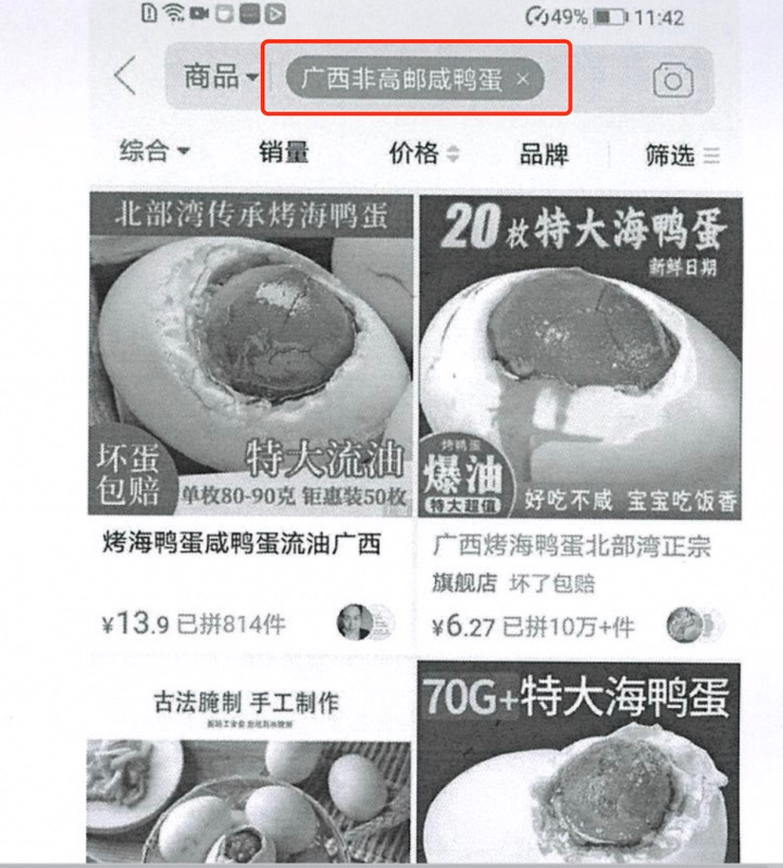 在电商如火如荼的发展时代,如何在平台上进行广告分发、吸引更多流量及关注,是广大商家一直追求的目标。很多商家绞尽脑汁的希望通过关键词吸引更多客户。但是引流也需要合法合规,本案就是典型的例子。本案件中,原告认为被告在某平台上销售的产品链接中使用“非高邮”字眼,而被告的产品却产自广西,以此认为被告属于恶意攀附流量,不正当的挤占了原告的市场空间。按照正常人的思维来看,如果被告以及被告的产品与高邮无关,直接标记真实产地不是更清楚吗?为何要标记“非高邮”呢?辉知队和大家一样,总感觉哪里不对劲。但是从原告的证据中,辉知队发现原告的购买公证使用的检索关键字是“广西非高邮咸鸭蛋”。如果原告想证明被告使用“非高邮”属于恶意攀附流量,辉知队认为原告通过“广西非高邮咸鸭蛋”关键字检索的举证方式无法达到其证明目的。因为“广西非高邮咸鸭蛋”检索出来的店铺,起到引流作用的可能“广西”、“咸鸭蛋”、“高邮”等任意字体的组合。因此,无法证明检索结果是被告的链接中“非高邮”三字产生的。正确的举证方式应该是在拼多多首页,检索“高邮”二字,在检索出来的商品展示页中,如果发现被告带有“非高邮”关键字的商品在原告的会员单位或者其他标记“高邮”鸭蛋的商品之前的,则被告才有可能存在以“非高邮”攀附流量的情形。因此,至少从原告提供的证据来看,辉知队认为其难以证明被告存在“区别式攀附”流量的行为。